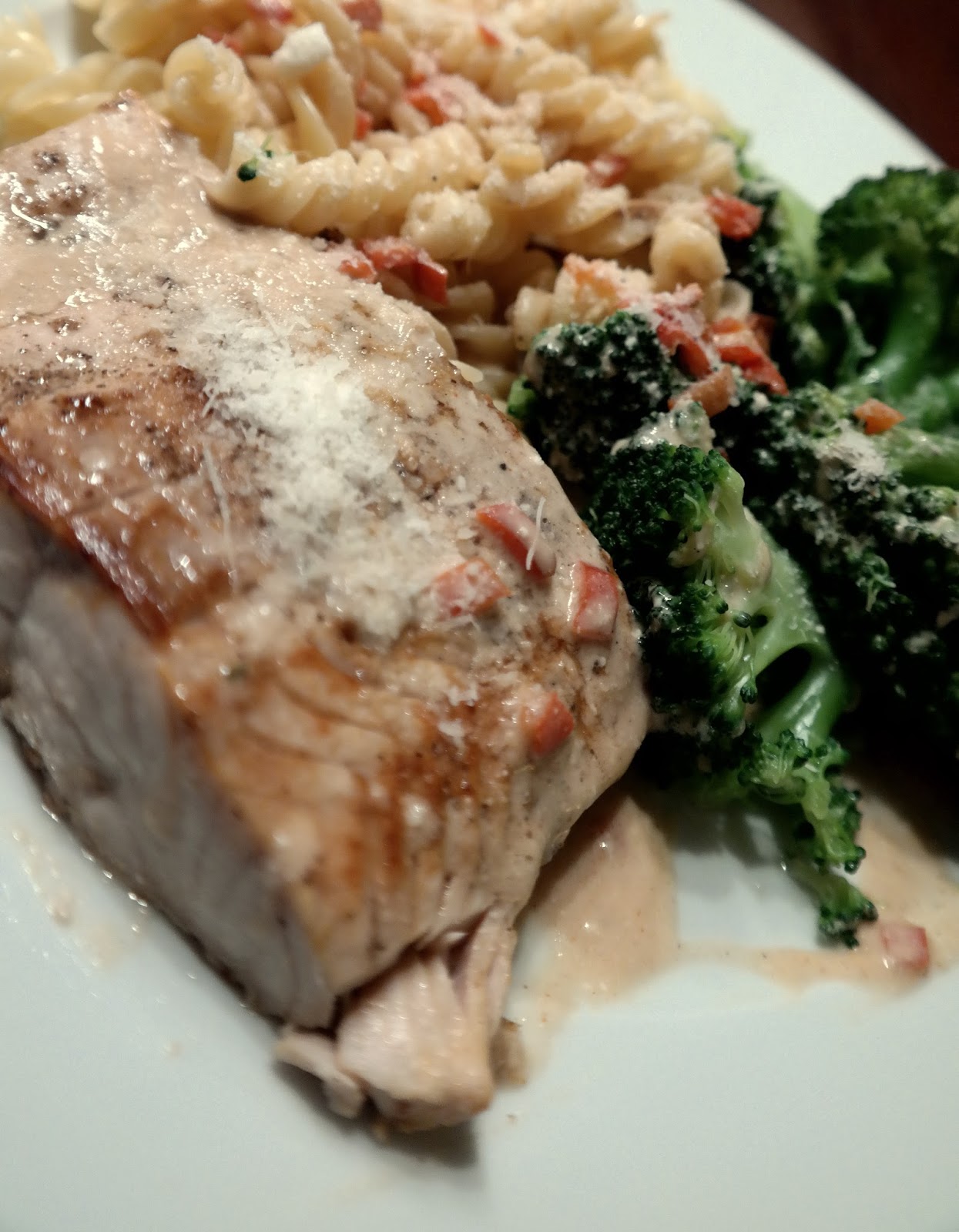 Dazu gibt es die meiste Zeit im Jahr Brokkoli und Bandnudeln. Zur Spargelzeit im Frühjahr bevorzuge ich grünen Spargel und auch Garnelen anstatt des Lachs schmecken hervorragend. Wirklich grandios und vielfältig.